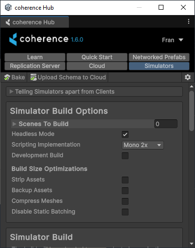 A Simulator build is a built Unity Player for the Linux 64-bit platform that you can upload to coherence straight from the Unity Editor.