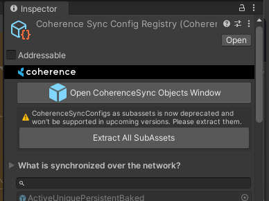 For 1.2, we have avoided manual migration of existing sub-assets. You can trigger this operation from the registry inspector (Assets/coherence/CoherenceSyncRegistry). We don't automate this operation, since the extraction changes the asset GUIDs of the configs, which could lead to missing references. This is specially true if your project is referencing the configs directly, instead of going through the registry. Keep this in mind when you decide to extract existing sub-assets.