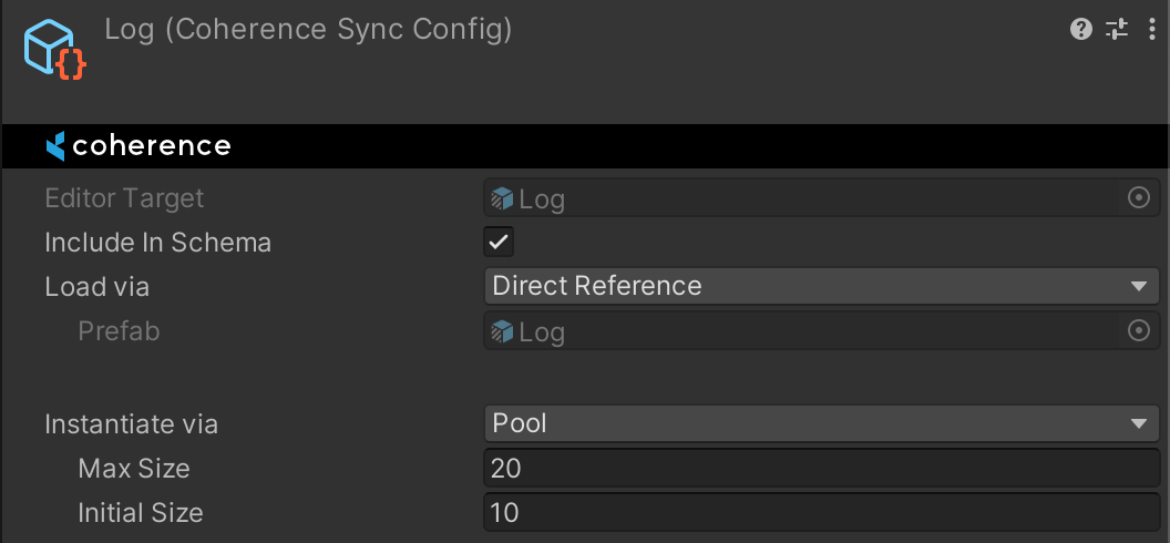 A pool configured like this means that coherence will pre-spawn 10 instances of the Prefab at the beginning of the game.