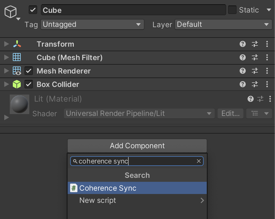 Next, we add the CoherenceSync component to Cube.