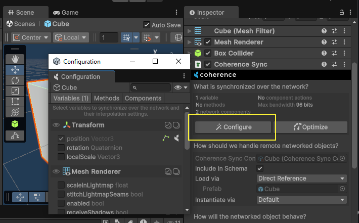 To select which properties you want to network, open the Configure window, accessible from within the CoherenceSync Inspector.