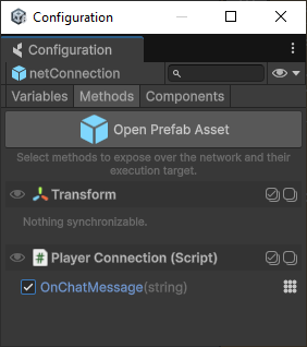 Note that there's a separate field for the *Simulator Connection Prefab*. It can be used to spawn a completely different object for the Simulator connection that may contain Simulator-specific commands and replicated properties. If the field is left empty, no object will be created for the Simulator connection.
