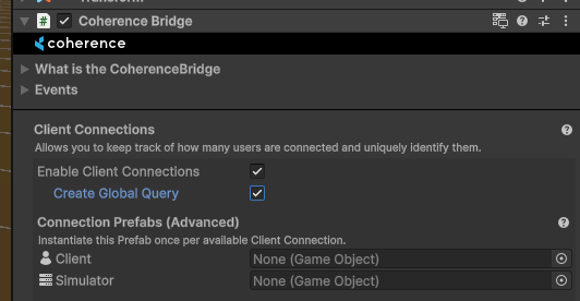 Despite being CoherenceSync prefabs, Client Connections behave differently to normal entities. Please, mind this if you're using the convenience offered by CoherenceBridge to spawn CoherenceSync prefabs.