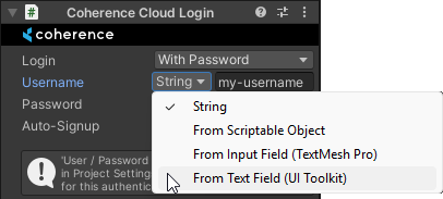 You can also pick another input method using the dropdown to support players providing their own credentials at runtime. Three input methods are support in addition to raw strings at this time: ScriptableObject assets, UI Toolkit Text Fields and TextMesh Pro Input Fields.