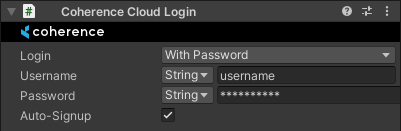 The CoherenceCloudLogin component provides a no-code solution for logging in to coherence Cloud.