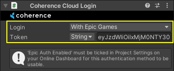 The With Epic Games login method can be used to log in to coherence Cloud with an Epic Games account.