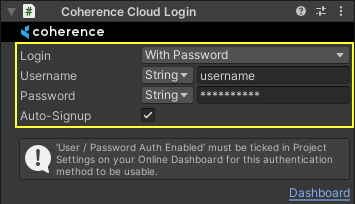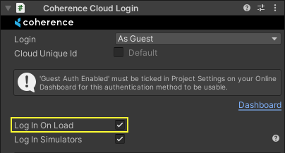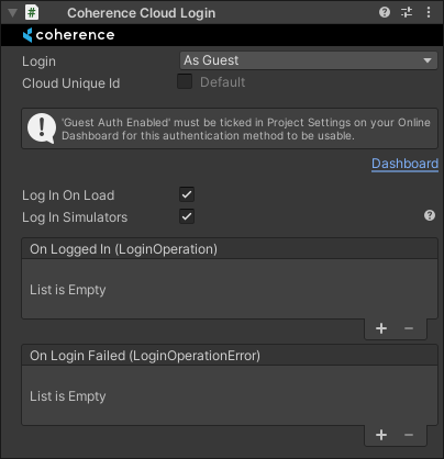 If the Log In On Load option is enabled, the component will automatically start logging in to coherence Cloud when it is loaded.