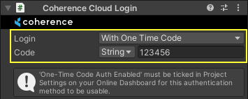 The With One-Time Code login method can be used to log in to coherence Cloud with a temporary code acquired using PlayerAccount.GetOneTimeCode.
