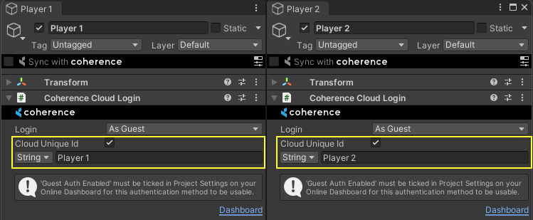 It is also possible to use multiple CoherenceCloudLogin components to log into multiple separate PlayerAccounts simultaneously on the same device. This might be useful in a game that supports local multiplayer.