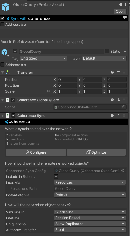 In order to create a global query, a CoherenceGlobalQuery component has to be added to a networked Prefab (i.e. one with CoherenceSync attached):