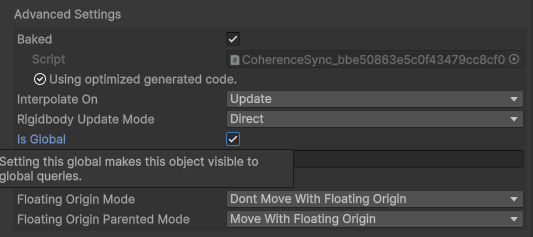Making a networked object global is as simple as checking the "**Is Global**" toggle in the CoherenceSync config window. From now on that object will be visible to every client with the CoherenceGlobalQuery enabled.