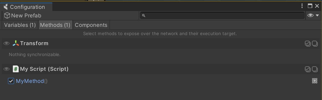 By clicking on the method, you bind to it, defining a command. The grid icon on its right lets you configure the routing mode. Commands with a Send to State Authority Only mode can be sent only to the state authority of the target CoherenceSync, while ones with the Send to All Instances can be broadcasted to all Clients that see it. The routing is enforced by the Replication Server as a security measure, so that outdated or malicious Clients don't break the game.