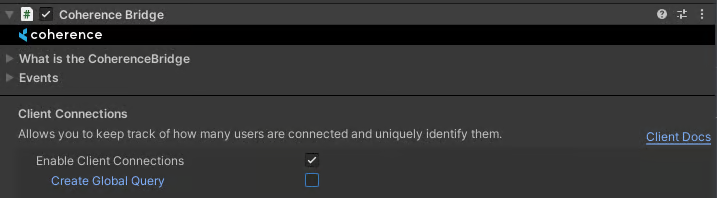 A global query can be created manually as part of a prefab by using the CoherenceGlobalQuery component. This prefab can then be transferred to other clients from the simulator to give those clients access to the global client connections.