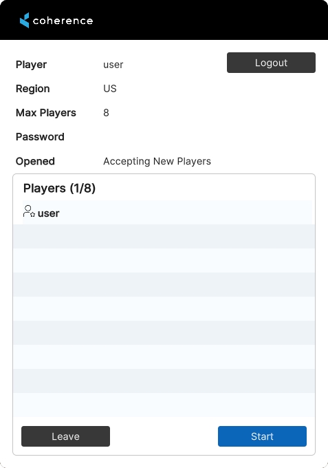 The Matchmaking UI sample contains a dialog created using the UI Toolkit that covers logging into a coherence Cloud Player Account using a username and password, including our powerful Matchmaking and the coherence Lobbies feature.