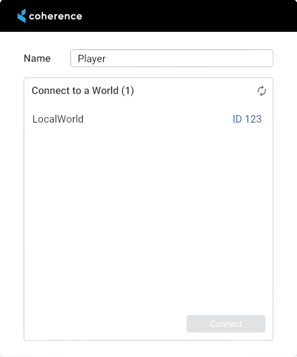 The Worlds UI sample contains a dialog created using Unity UI that can be used to browse and join Worlds hosted in the coherence Cloud or in locally hosted Replication Servers.