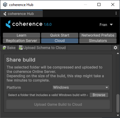 Select the platform, browse for the previously-created build, and click **Upload Game Build to Cloud**.