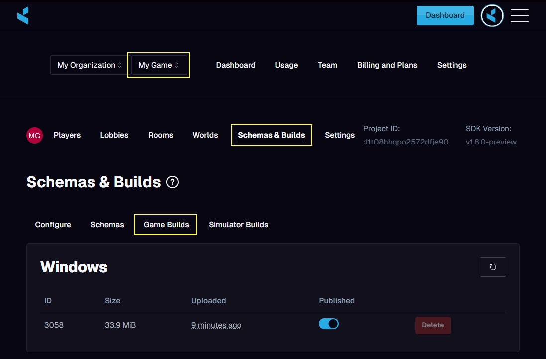 After executing your script, if everything was configured properly, you should see the uploaded builds appear in your Online Dashboard under the project you targeted, in the Schemas & Builds > Game Builds section.