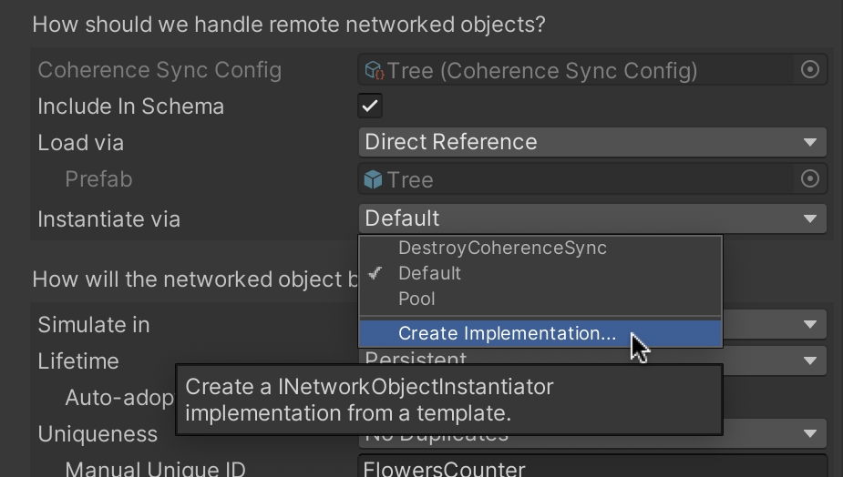 Once created, implementations of this interface will appear in the Instantiate via dropdown shown above, or in the corresponding CoherenceSyncObject asset.