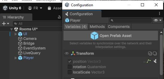When the Configure window is open it will show the variables, methods and component actions available for synchronization for your currently selected GameObject.