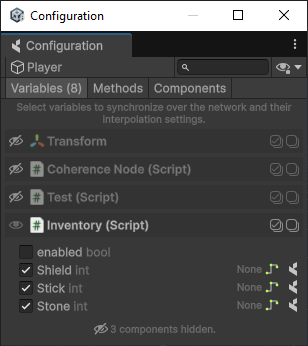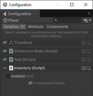 Since the inventory items are not immediately accessible as fields or properties, they are not listed in the *Configure* window. In order to expose the inventory items so they can be synced across the network, we need to implement a custom `DescriptorProvider`.