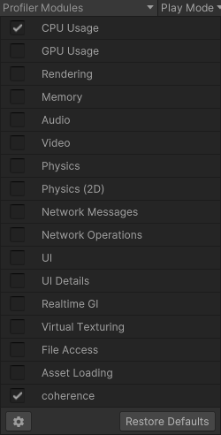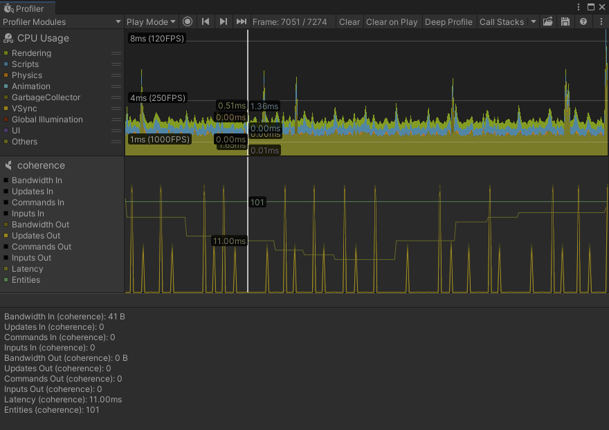 <figure><img src="https://215322450-files.gitbook.io/~/files/v0/b/gitbook-x-prod.appspot.com/o/spaces%2FYYuUg3g2Mq8aiI7le9ai%2Fuploads%2Fgit-blob-0bae7d1860343a2391b700728fc12d131fe8873e%2Fimage.png?alt=media" alt=""><figcaption><p>Unity Profiler with Coherence module</p></figcaption></figure>