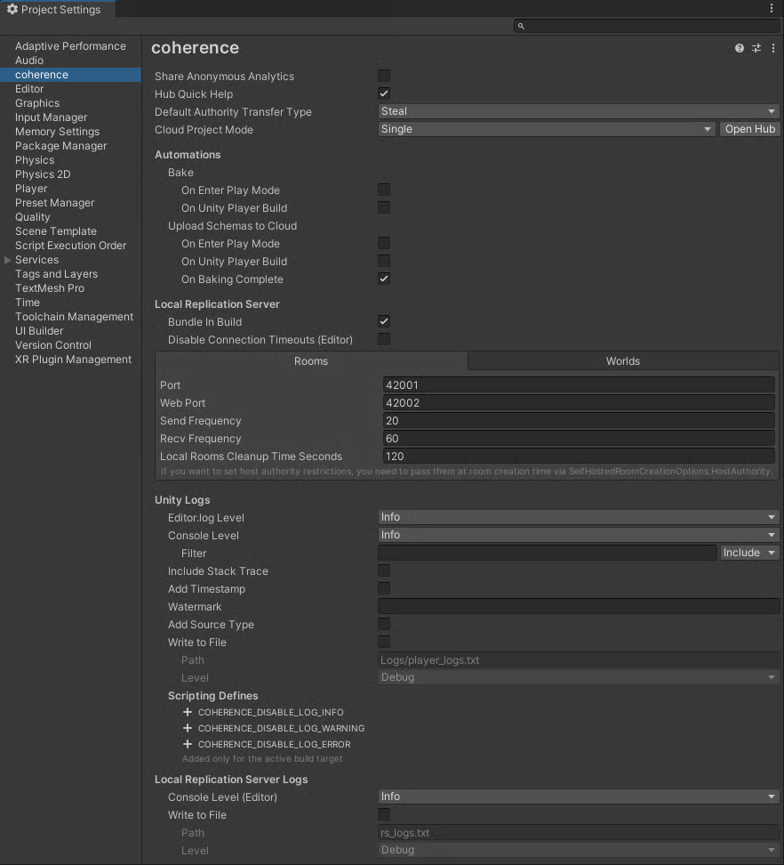 Accessible via `coherence > Settings` and `Edit > Project Settings... > coherence`.
