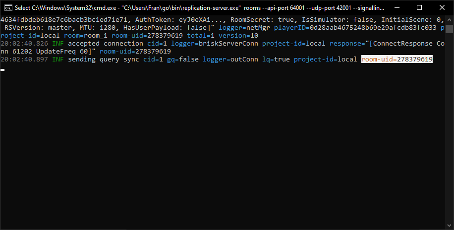 The local Replication Server will print out the **Room ID** and **unique Room ID** that you can use when connecting the Simulator.