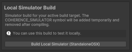 Once installed, you can create a local simulator build by clicking the '**Build Local Simulator (`target`)**' button from within the Simulator tab in coherence Hub (coherence > Hub), where `target` is the operating system on your local machine.