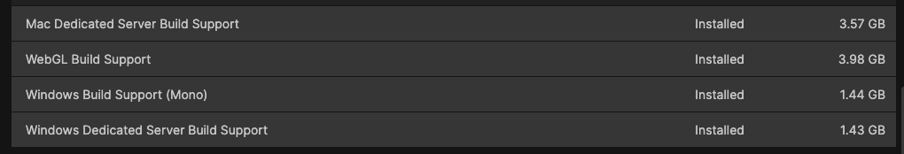 <figure><img src="https://215322450-files.gitbook.io/~/files/v0/b/gitbook-x-prod.appspot.com/o/spaces%2FYYuUg3g2Mq8aiI7le9ai%2Fuploads%2Fgit-blob-e2dbf2c1bdb06ecc8dc84eb01b5615e468a2c9c9%2Fimage.png?alt=media" alt=""><figcaption><p>Installed modules in the Unity Hub showing Dedicated Server build support for Mac and Windows</p></figcaption></figure>
