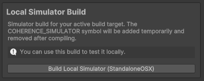 The COHERENCE_SIMULATOR symbol is added during the local simulator build. Symbols can be examined in the Player Settings and can be found at Edit > Project Settings... in the Player tab under Script Compilation.