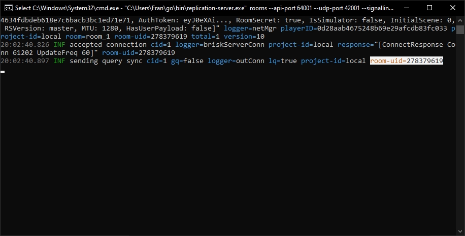 The local Replication Server will print out the Room ID and unique Room ID that you can use when connecting the Simulator.