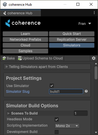 When using the Simulators tab in the coherence Hub, you can enable the Use Simulator option and specify a Simulator Slug. This is simply a unique identifier for a Simulator. This value is automatically saved in RuntimeSettings