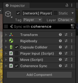 While in Play Mode, try selecting a remote player character. You will notice that some of its script have been disabled by coherence: