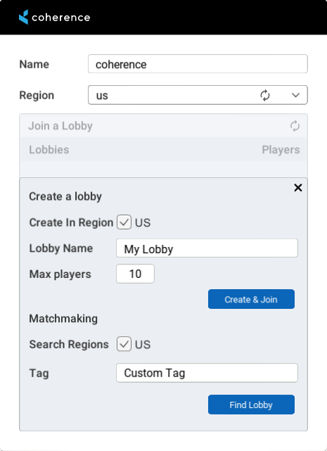 The Matchmaking UI sample contains a dialog created using the UI Toolkit that covers logging into a coherence Cloud Player Account using a username and password, including our powerful Matchmaking and the coherence Lobbies feature.