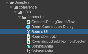 The Rooms UI sample contains a dialog created using Unity UI that can be used to browse, create and join Rooms hosted in the coherence Cloud or in a locally hosted Replication Server.