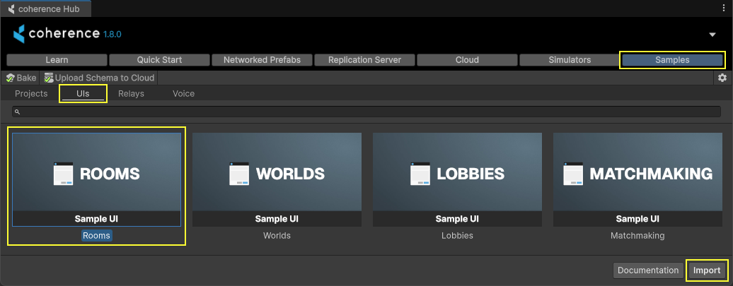 To import a sample UI into your project, open coherence via coherence > Hub, go the Samples page, select the sample you want under the UIs tab, and press Import.