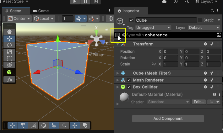 Next, we add the CoherenceSync component to Cube.