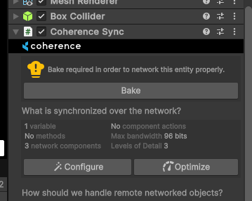 CoherenceSync componentFor an object to be networked through coherence, it needs to have a CoherenceSync component attached, and be a Prefab.