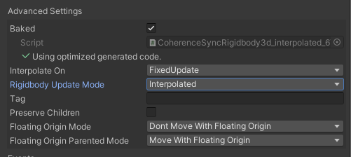 The CoherenceSync component supports three modes for replication of Unity rigid bodies: