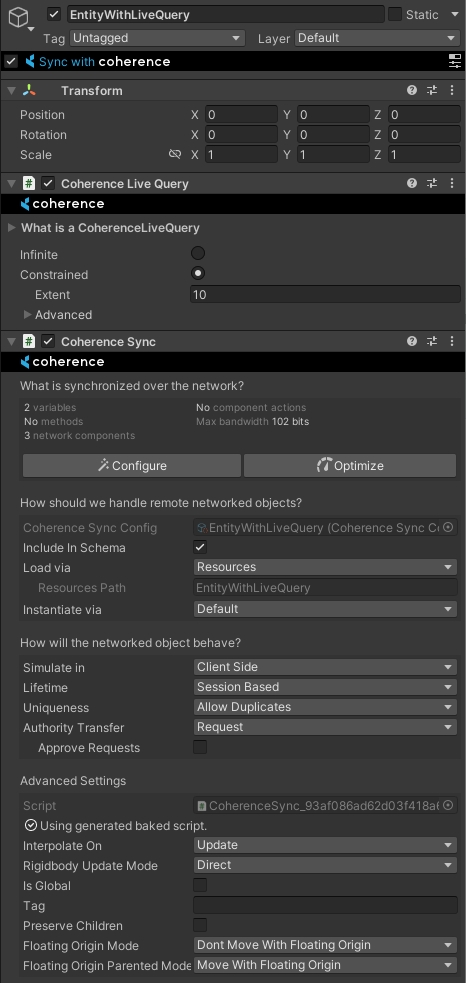 }Constructing a Prefab that has Simulator authority but benefits a Client with the area of interest is simple. It requires that the Authority Transfer mode is Request and that there is a Coherence Live Query component. It is also possible to add any kind of query to these Prefabs or multiple types and the Client will benefit from them all.